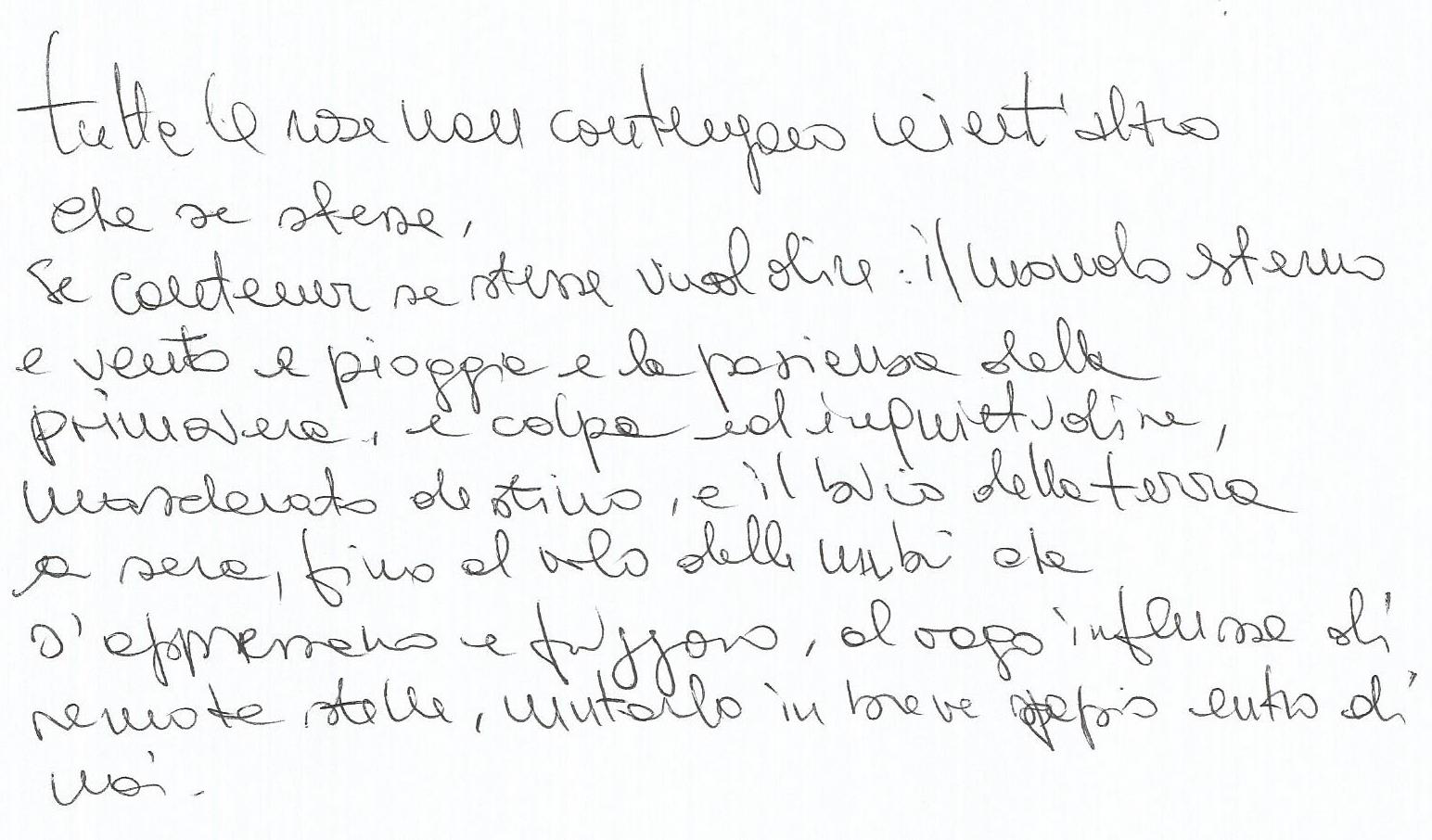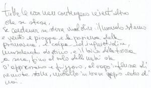 Le scritture appartengono alla stessa mano, lo scrivente è un mancino che normalmente scrive in corsivo. La maggiore verticalità espressa nello stampatello è frutto di un maggior controllo impiegato nel gesto scrittorio, mentre nel corsivo il gesto è più spontaneo e la scrittura, a causa del mancinismo, si rovescia in maniera del tutto naturale; alcune forme si ripetono in entambi gli stili, come la lettera u che presenta la parte di destra più alta, o l’ovale della o che rimane aperto nel medesimo modo.